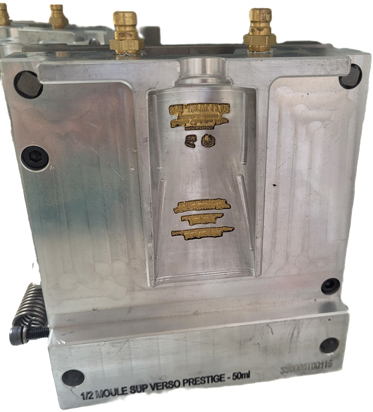 Outil immédiatement opérationnel, un temps de mise au point minimal. Réactivité à vos demandes. Fiabilité et durabilité de l'outil. Nos moules de marquage sont usinés dans des blocs d'aluminium, à partir d'une digitalisation de la forme du flacon moulé.