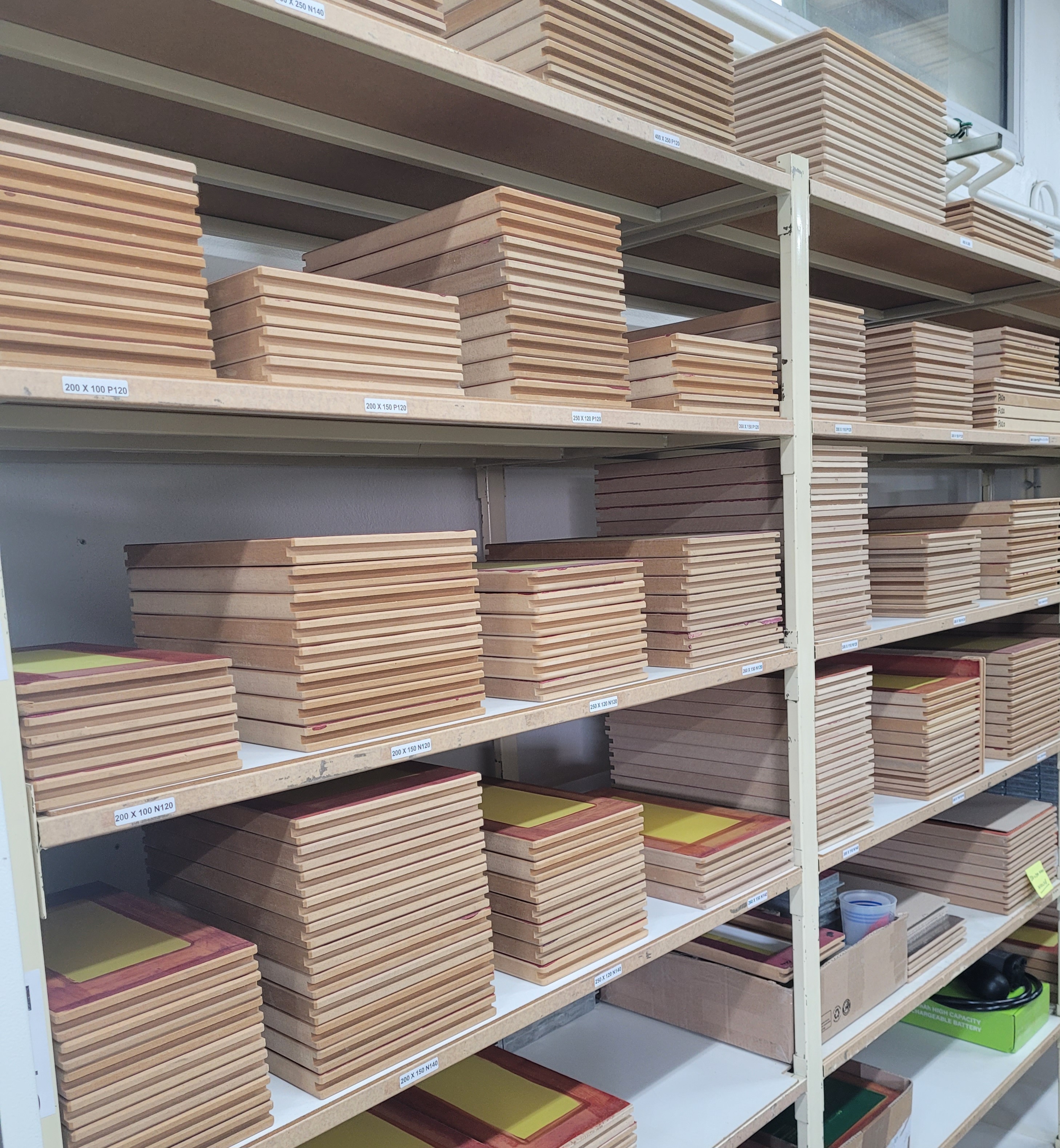 Enfin nous pouvons vous fournir des cadres en carré d'aluminium à vos cotes. Nos équipements nous permettent de graver des écrans jusqu'à une dimension maximum d'environ 1m x 1,2 mètre, et de tendre des écrans en trame droite sur des cadres de dimensions maximum 1,5 m x 2,5 mètres. Nous disposons d'un large stock de cadres MDF pour répondre à vos demandes dans les meilleurs délais. Notre machine de tension automatique à commande numérique, (une des rares de ce type en France), nous permet de garantir la régularité et la répétabilité de la tension des cadres que nous fournissons.